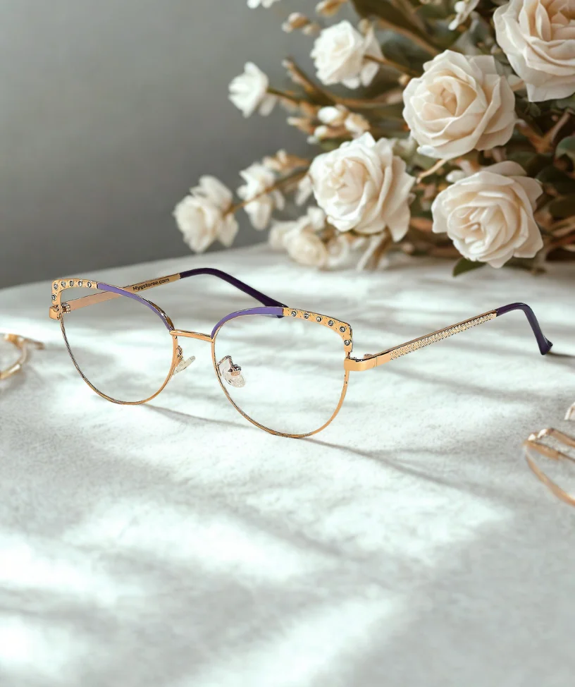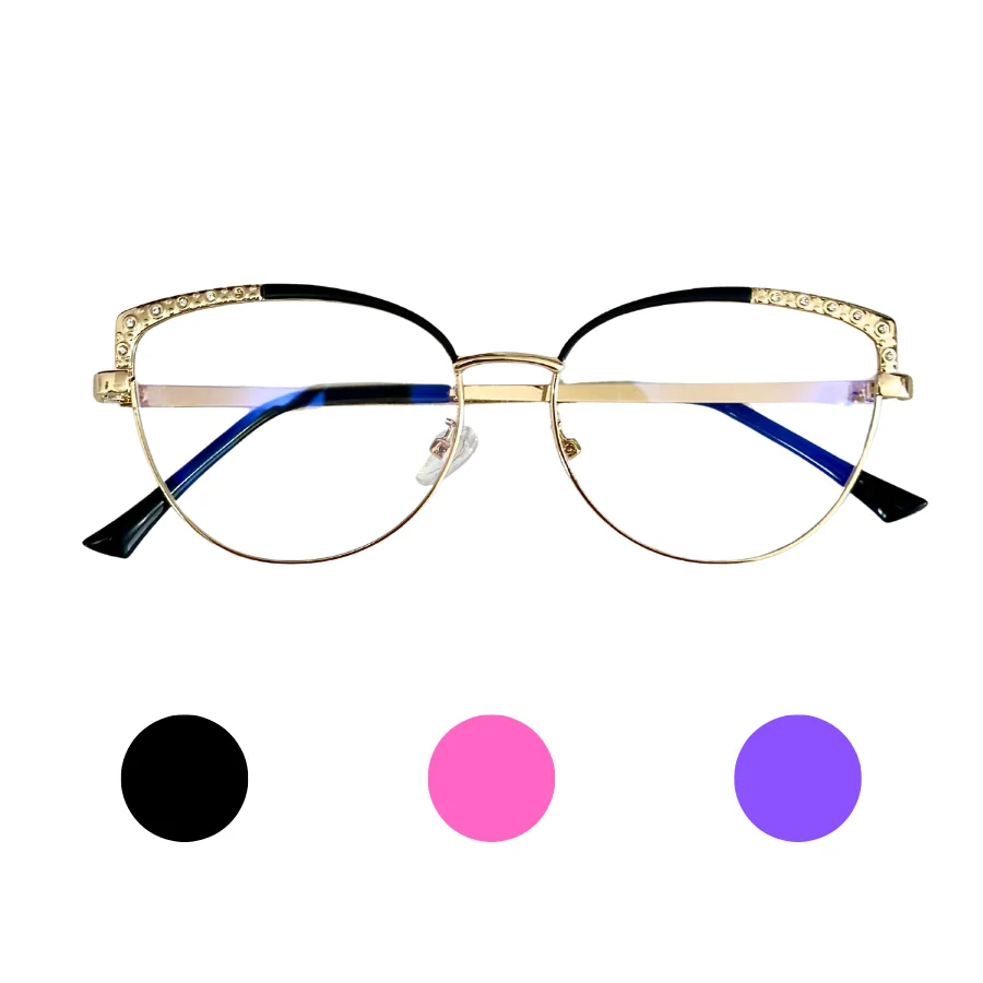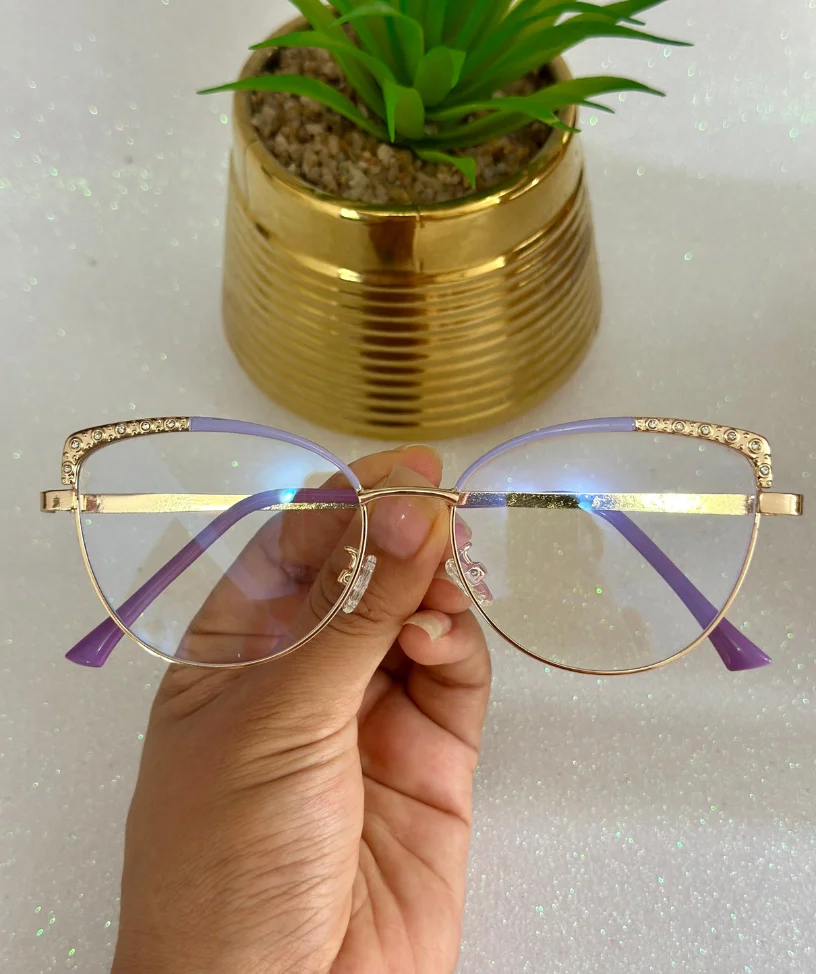 Púrpura Místico: Sumérgete en la elegancia con estos lentes de descanso en un tono púrpura místico. El diseño en ojo de gato agrega un toque sofisticado, mientras que los detalles brillantes en las esquinas reflejan tu estilo único.