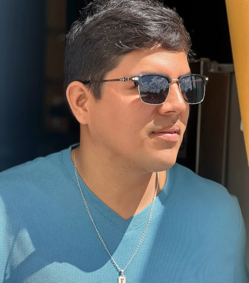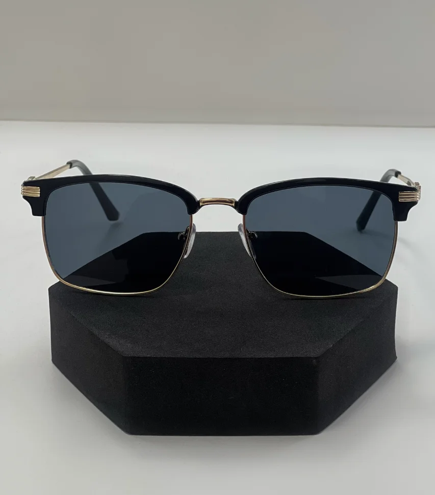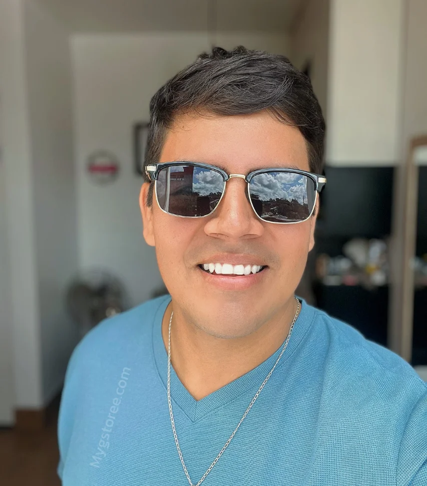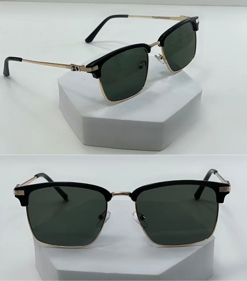 El marco superior en color negro añade un toque de modernidad y vanguardia, mientras que los detalles dorados en las bisagras y las patillas aportan un aire de lujo y exclusividad que no pasará desapercibido. Las lentes verdes de los Lentes Orión no solo protegen tus ojos de los dañinos rayos UV, sino que también ofrecen una visión clara y sin distorsiones, permitiéndote disfrutar de una protección ocular superior sin sacrificar el estilo.
