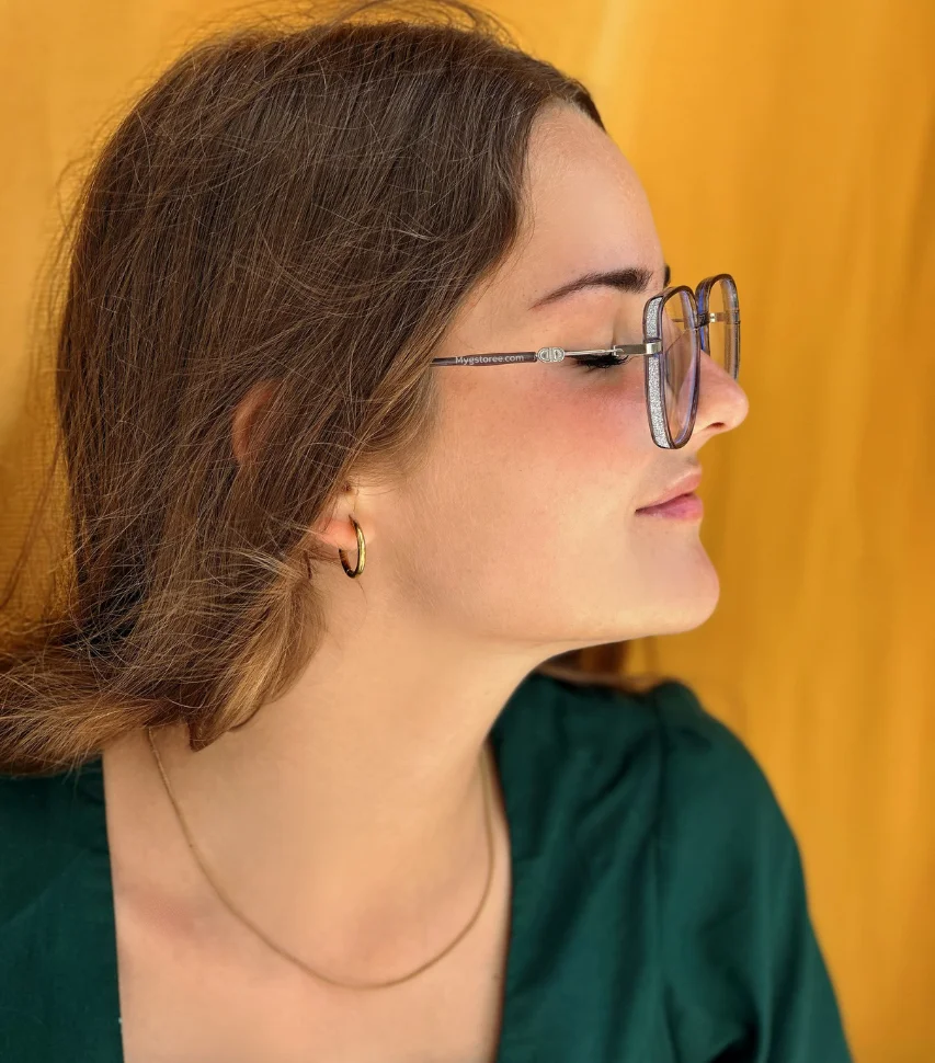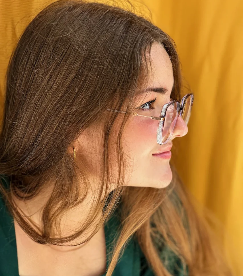 Diseño: Estas gafas tienen una forma cuadrada, lo que les da un aspecto moderno y elegante. El marco está hecho de metal y presenta detalles de purpurina, lo que agrega un toque de sofisticación.
